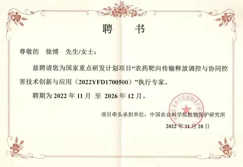 喜訊|好年景總經理徐博被聘為國家重點研發(fā)計劃項目“農藥靶向傳輸釋放調控與協(xié)同控害技術創(chuàng)新與應用”執(zhí)行專家